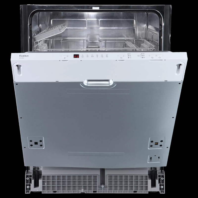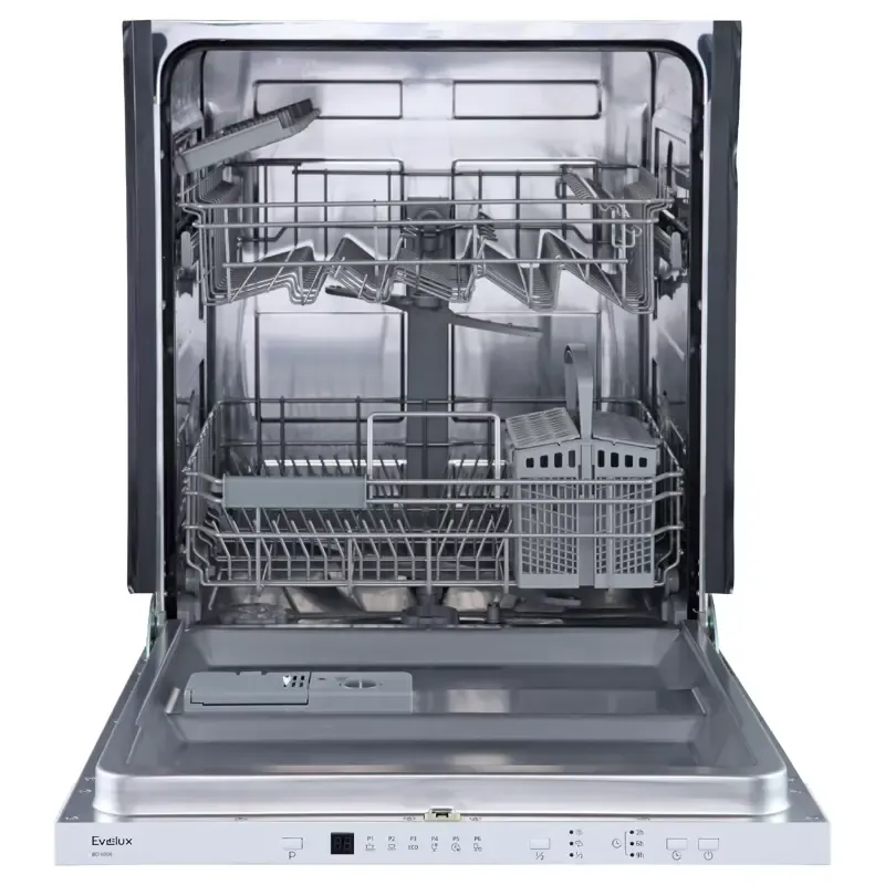 Встраиваемая посудомоечная машина Evelux, 60 см, 13 комплектов, 6 программы, 2 корзины, переносная корзина для столовых приборов, регулировка корзины по высоте, электронное управление, дисплей + LED индикаторы, звуковая индикация, половинная загрузка, двигатель коллекторный, энергоэффективность А++, уровень шума 55 дБ