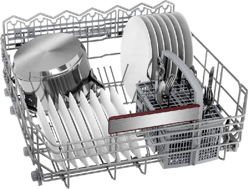 Машина рассчитана на загрузку до 13 комплектов посуды, что делает её подходящей для каждой семьи. Внутреннее пространство с двумя корзинами можно гибко организовать благодаря держателям, которые регулируются и позволяют изменять высоту. Управление осуществляется через скрытую сенсорную панель с дисплеем, отображающим ход программы. Для мойки доступен спектр режимов от экономичного Eco 50°C с минимальным расходом электрической энергии до интенсивного при 65°C и быстрого цикла «1 час». Ключевые технологии включают функцию IntensiveZone для усиленной мойки в нижней корзине, режим Hygiene+ для гигиеничной обработки при высокой температуре и опцию VarioSpeed Plus, сокращающую время цикла за счёт того, что вода нагревается быстрее и до более высокой температуры, а её струи подаются под увеличенным давлением.