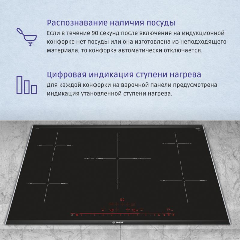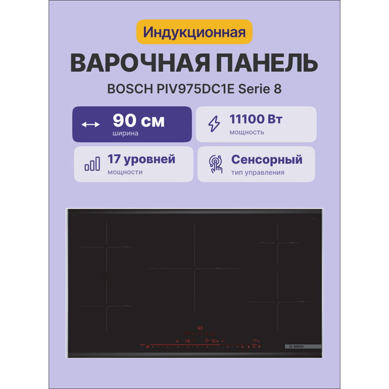 Варочная панель Bosch PIV975DC1E — это пять высокоэффективных зон нагрева и большой функционал. Широкая модель позволяет расположить большое количество предметов. Таймер с функцией выключения автоматически отключает индукционную конфорку по истечению заданного времени, что повышает уровень комфорта и обеспечивает безопасное использование. Сенсор жарения PerfectFry — это идеальное поджаривание продуктов до оптимального состояния.
