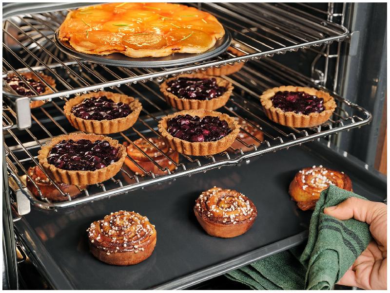 Внутреннее пространство объёмом 72 литра предоставляет широкие возможности для подготовки семейных и праздничных блюд: три уровня размещения и два противня в комплекте позволяют одновременно готовить несколько позиций, экономя время. Освещение камеры галогенным источником гарантирует яркий обзор содержимого при любом режиме, а хромированные съёмные телескопические направляющие обеспечивают устойчивое и удобное выдвижение противней. Система конвекции с кольцевым нагревом и опция влажной конвекции дают равномерное прогревание и корочку желаемой текстуры, что особенно важно при выпечке хлеба, пиццы и сложных многослойных блюд.