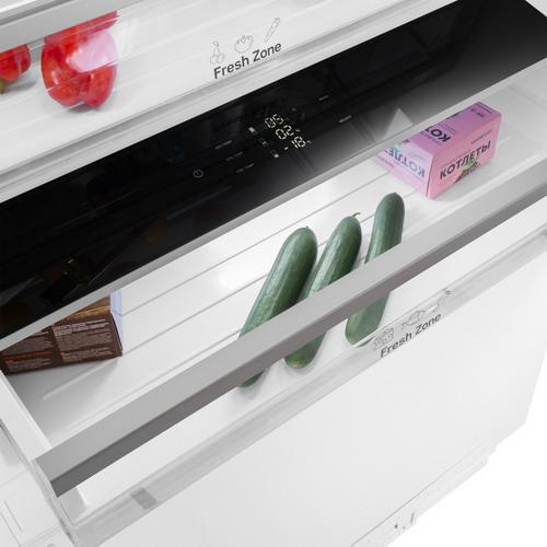 Встраиваемый холодильник Maunfeld MBF212NFW0 с интеллектуальной технологией Total No Frost предназначен для расположения в шкафу с размером ниши 213,4х75х60 см. Цвет белый. Встроенный дисплей отображает температуру холодильной и морозильной камер. Управление — сенсорное. Модель оборудована системой Air flow, которая обеспечивает равномерное охлаждение по всему объему камеры. Есть режимы «Суперзамораживание» и «Суперохлаждение».