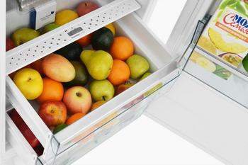 Технология V-Lift позволяет регулировать высоту установки полки на двери по полозьям вверх/вниз для возможности размещения продуктов различного размера. Очень полезная функция для максимального использования пространства!