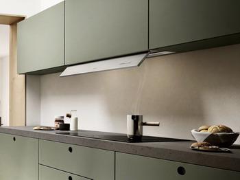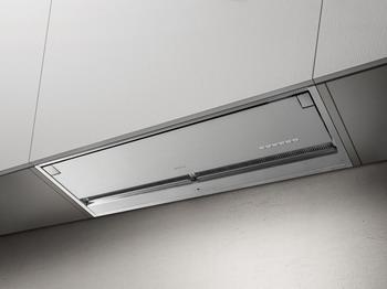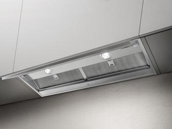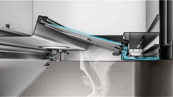 Система резисторов работает в сочетании с наклонной механической решетчатой конструкцией, по которой капли стекают в извлекаемую ванночку, и защитной передней панелькой, отводящей пары от дверок навесной мебели, благодаря наклону в 45°.